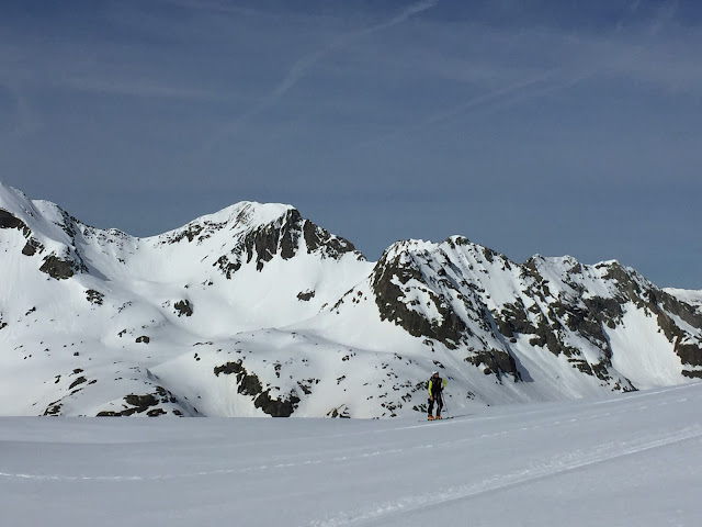 El sol ya nos calienta y poco a poco va transformando la nieve. Un gozo lo bien que agarra en comparación con el día anterior. Estamos en cota 2450-2500 mts cuando me quito las cuchillas. No se pueden pedir mejores condiciones. Félix es más cauto y las mantendrá hasta el final. Más por comodidad mental que por necesidad.